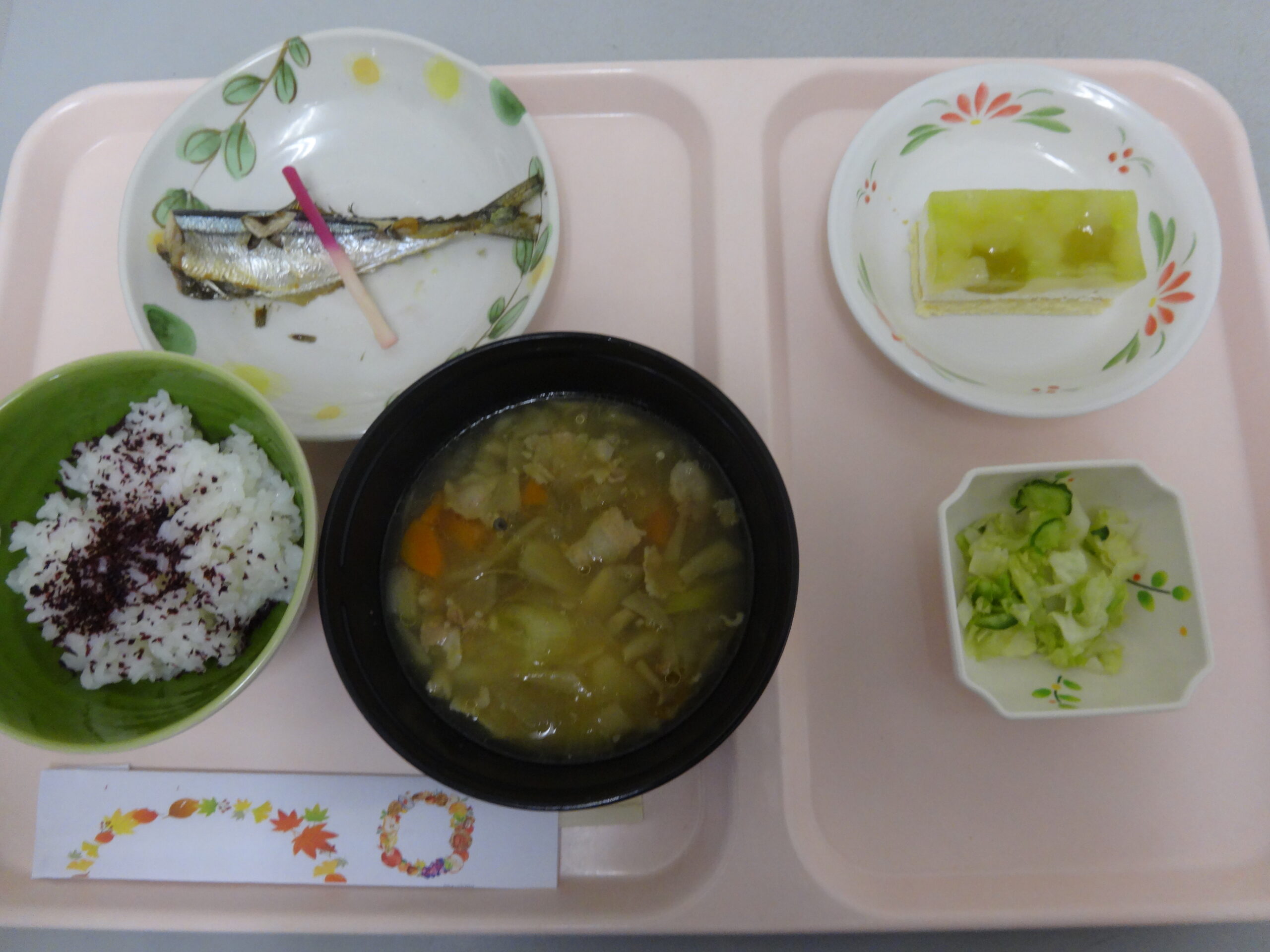 メニュー:ゆかりご飯・芋汁・さんまの塩焼き・キャベツきゅうり漬け・洋梨ぶどうケーキ